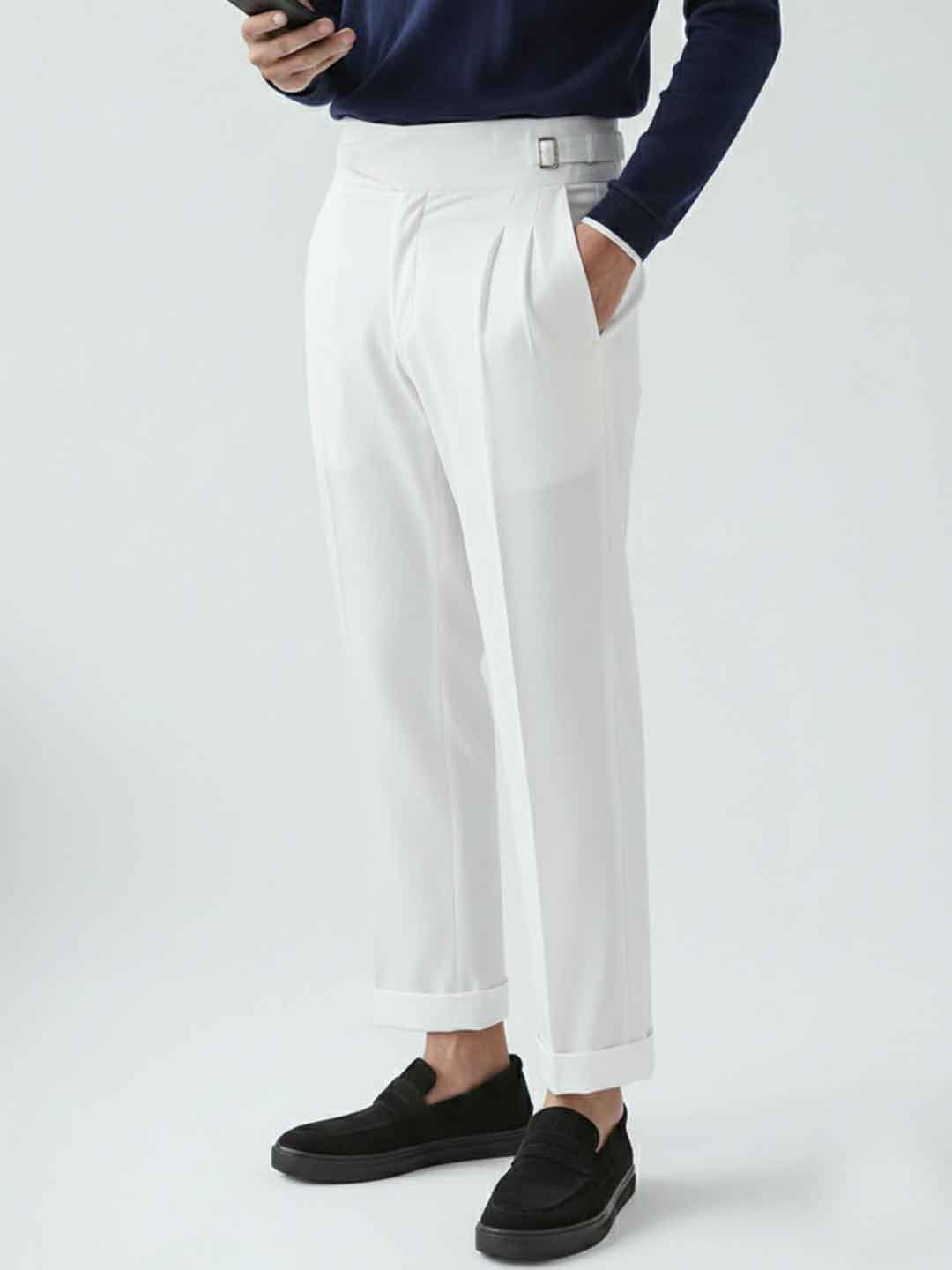 The Double-Buckle Gurkha Pant in Black combines timeless military heritage with contemporary tailoring. Featuring distinctive dual buckles at the waist and high-rise construction, these trousers deliver a refined silhouette with authentic character. The structured fabric maintains its shape throughout the day, while the classic black colorway ensures versatile styling across formal and smart-casual occasions. Precision pleating and tapered legs complete the sophisticated aesthetic that discerning dressers appreciate.